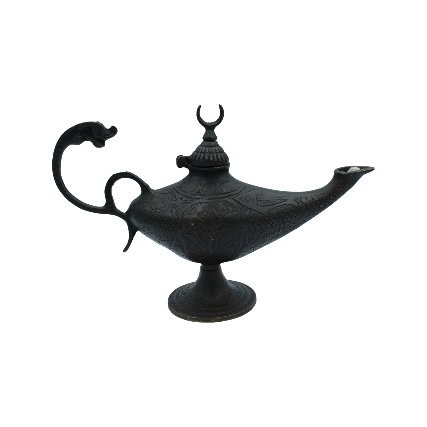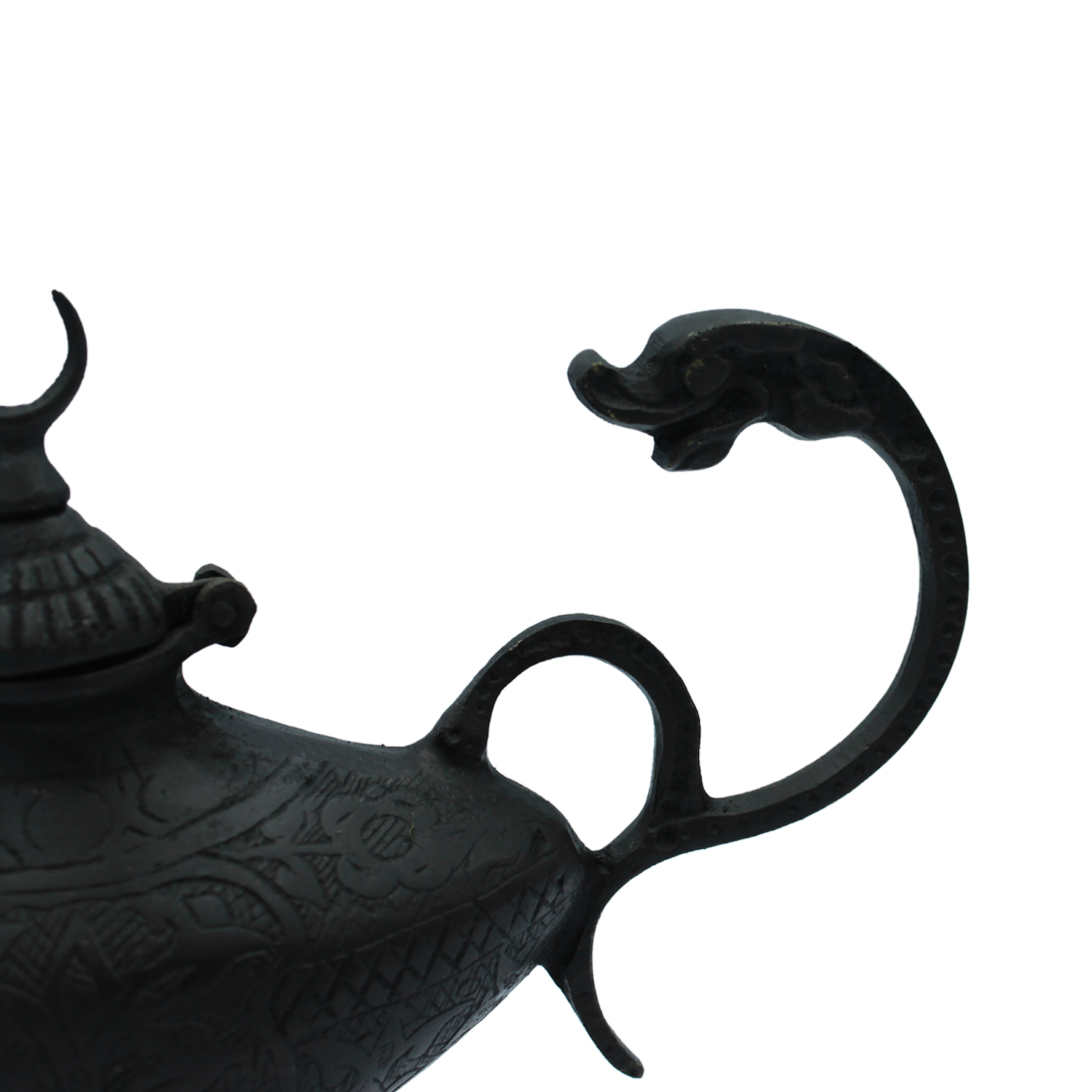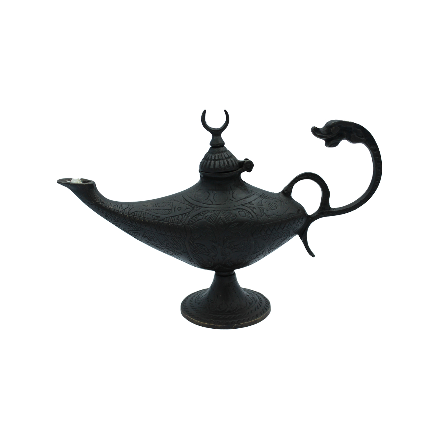 Features: engraved body, serpent handle, crescent lid, wick-ready spout