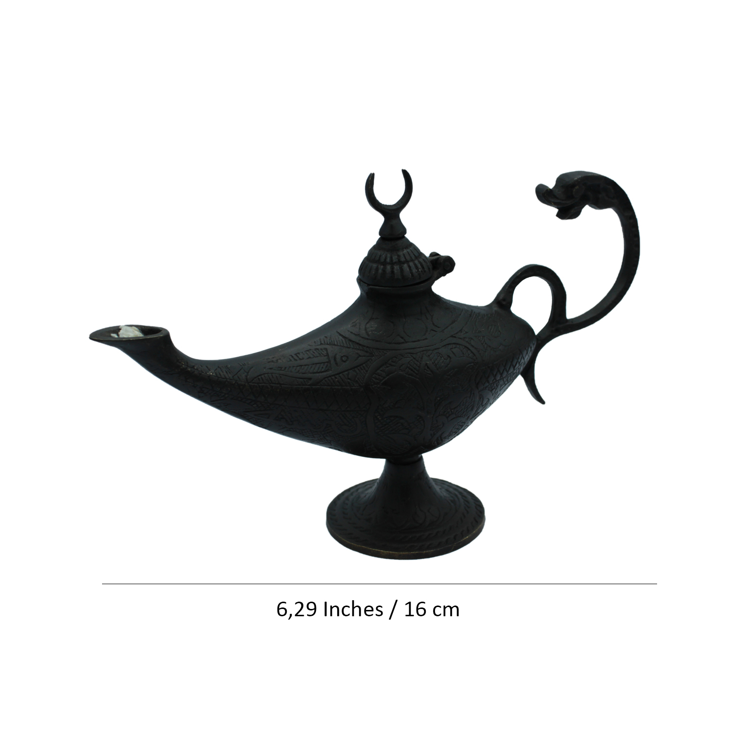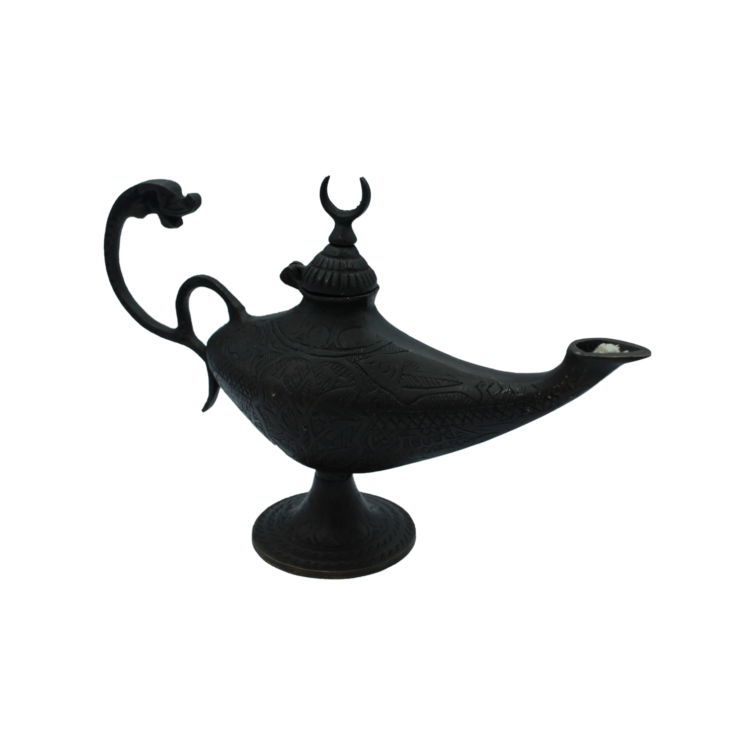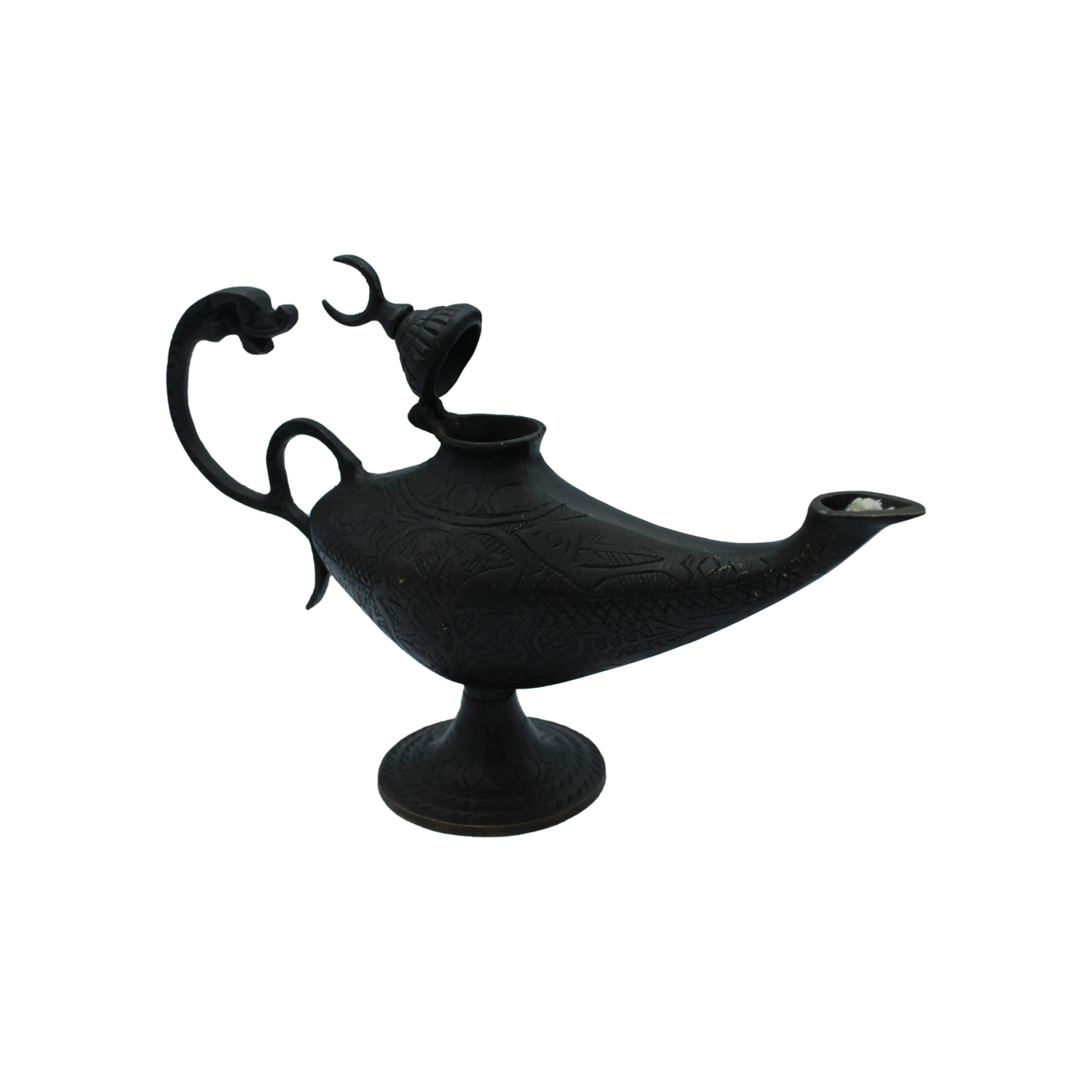 Features: engraved body, serpent handle, crescent lid, wick-ready spout